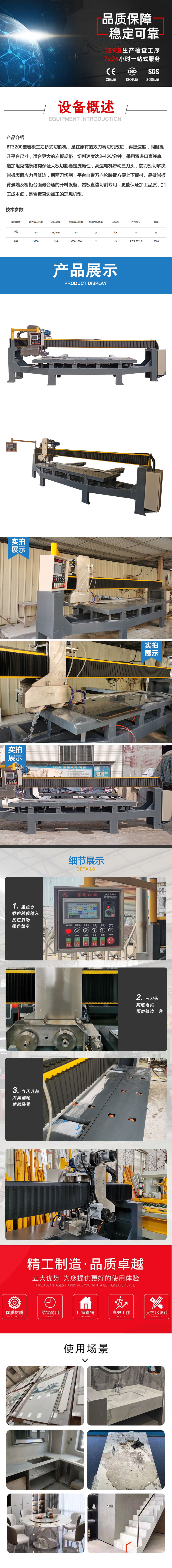 BT3200型巖板三刀橋式切割機(jī),主要用于直邊開料切割,具有單任務(wù)或多任務(wù)的設(shè)置,可實(shí)現(xiàn)自動(dòng)回刀多任務(wù)切割。省時(shí)省力,是大板巖板加工利器,可達(dá)3-4米/分鐘,采用雙進(jìn)口直線軌道加坦克鏈條結(jié)構(gòu)保證大板切割穩(wěn)定流暢性,高速電機(jī)帶動(dòng)三刀頭,前刀預(yù)切解決巖板表面應(yīng)力且修邊,后兩刀切割,平臺(tái)自帶萬向輪裝置方便上下板材。是做巖板背景墻及櫥柜臺(tái)面最合適的開料設(shè)備。巖板直邊切割專用,更能保證加工品質(zhì),加工成本低,是巖板直邊加工的理想機(jī)型。