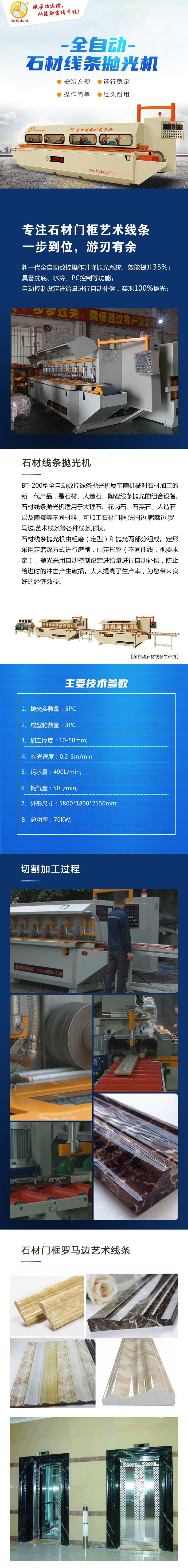 BT-200型全自動數(shù)控線條拋光機屬寶陶機械對石材加工的新一代產(chǎn)品,是石材、人造石、陶瓷線條拋光的組合設備,石材線條拋光機適用于大理石、花崗石、石英石、人造石以及陶瓷等不同材料,可加工石材門框,法國邊,鴨嘴邊,羅馬邊,藝術線條等各種線條形狀。