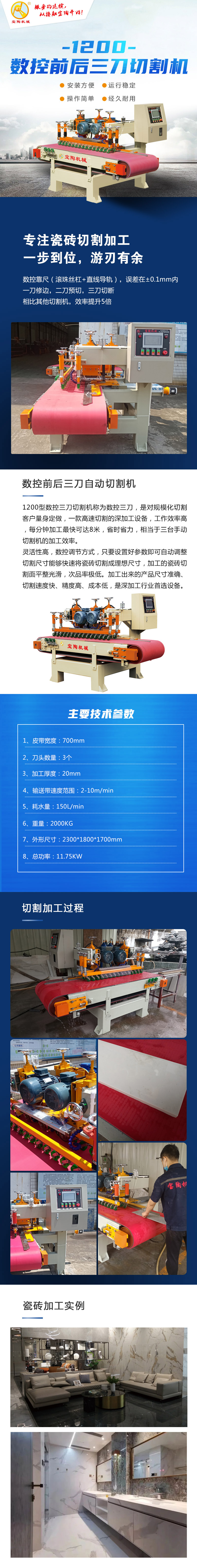1200型數(shù)控前后三組刀切割機(jī)俗稱為數(shù)控三組刀,是對規(guī)模化切割客戶量身定做,一款高速切割的深加工設(shè)備。最大可切割1.2米(1.2米瓷磚可對開成1200*600mm);有輸送帶流水線式自動批量切割,切割速度快;采用數(shù)控調(diào)節(jié)尺寸,精度高,誤差在0.1mm以內(nèi);采用三刀頭結(jié)構(gòu),不崩邊,切割帶修邊一次性過,直接切割出原廠邊效果,無需二次加工,更省事;效率是手推切割機(jī)的4倍。適合大批量瓷磚切割加工。