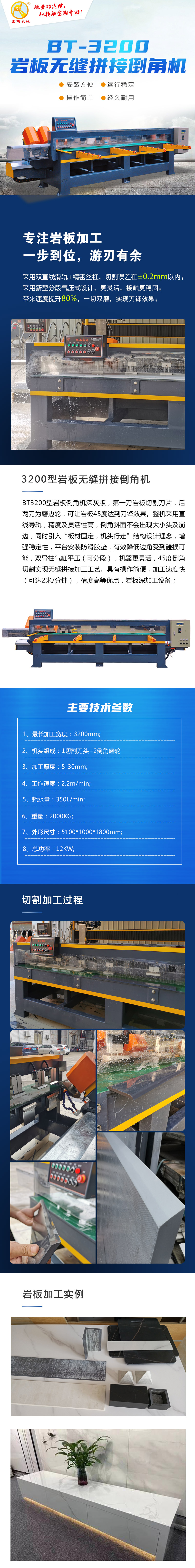 BT3200型巖板45度倒角機(jī),第一刀巖板切割刀片,后兩刀為磨邊輪,可讓巖板45度達(dá)到刀鋒效果。整機(jī)采用直線導(dǎo)軌,精度及靈活性高,倒角斜面不會(huì)出現(xiàn)大小頭及崩邊,同時(shí)引入“板材固定,機(jī)頭行走”結(jié)構(gòu)設(shè)計(jì)理念,增強(qiáng)穩(wěn)定性,平臺(tái)安裝防滑膠墊,有效降低邊角受到碰損可能,雙導(dǎo)柱氣缸平壓(可分段),機(jī)器更靈活,45度倒角切割實(shí)現(xiàn)無縫拼接加工工藝。具有操作簡(jiǎn)便,加工速度快(可達(dá)2米/分鐘),精度高等優(yōu)點(diǎn),巖板深加工設(shè)備;